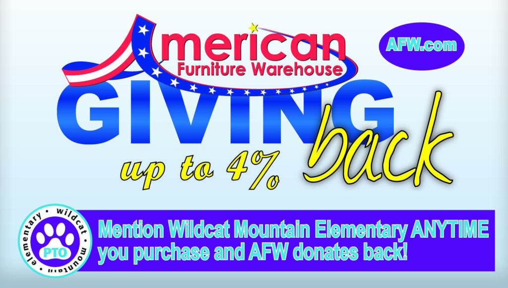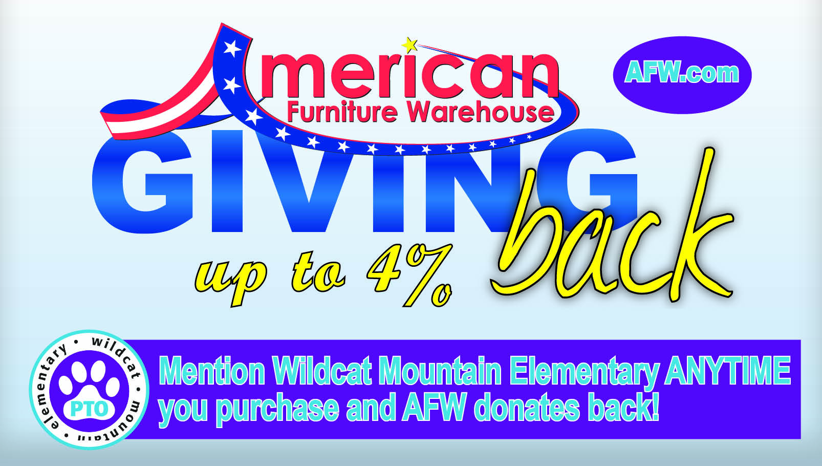 Great News! New School Partner! Purchases at American Furniture Warehouse ANYTIME OF THE YEAR support Wildcat Mountain Elementary. Just mention our school or our ID: WMEPTO at check-out. All details are included in the flyer: Wildcat Mountain Elementary School.